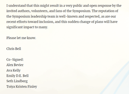 To be entirely upfront, my goal here is to offer a true accounting for what happened and preserve the Writers’ Symposium going forward. I think the Bells did a lot of good work in making the Symposium more diverse and progressive than ever, and I highly support that effort. But we must also acknowledge our mistakes and learn from them, to avoid repeat problems.