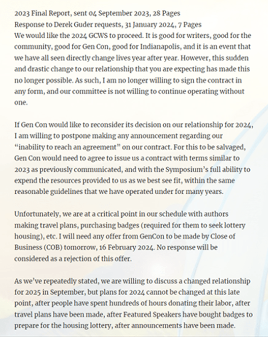 Herein, I present my findings about the recent conflict between Emily and Chris Bell, members of the leadership team (Chris was the de facto chair) for the Writers’ Symposium for 2024, and Gen Con, our contracting company that hosts the symposium every year at Gen Con in August. The Bells worked very hard and long to put on what was, by all accounts, an excellent Symposium.