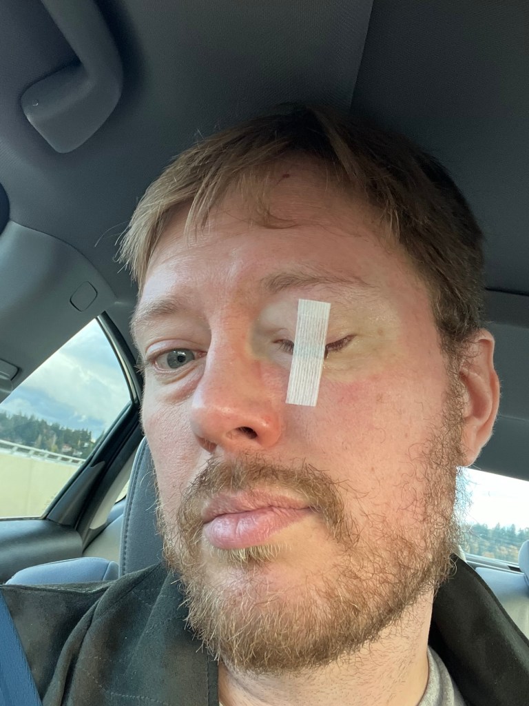 They taped my eye shut after the surgery. Sunglasses-free image below.
